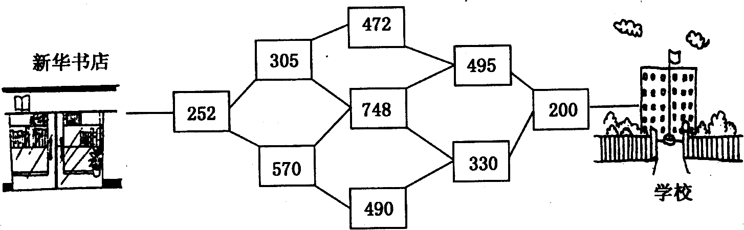 从新华书店到学校经过哪五站,才能使和等于2000?把这条路涂上颜色。