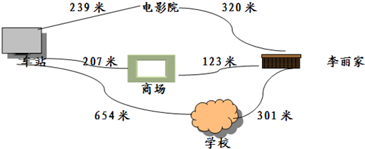 (1)从李丽家走最近的0条路到车站,要走多少米?