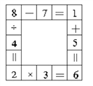 把l~8这八个数字分别填人空格中,使图中四边上的数字和运算符号正好组成加、减、乘、除四个等式。