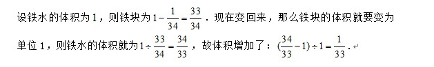 炉铁水凝成铁块 ,其体积缩小了1/34,那么这个铁块又熔化成铁水(不计损耗),其中体积增加了几分之几?