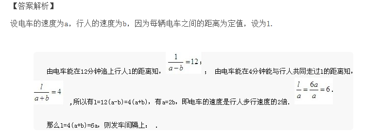 某人沿电车线路行走,每12分钟有一辆电车从后面追上,每4分钟有一辆电车迎面开来.假设两个起点站的发车间隔是相同的,求这个发车间隔.