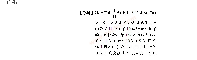 实验小学六年级有学生152人.现在要选出男生人数的1/11 和女生5人,到国际数学家大会与专家见面.学校按照上述要求选出若干名代表后,剩下的男、女生人数相等.问:实验小学六年级有男生多少人?