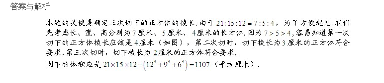 一个长、宽、高分别为 厘米、 厘米、 厘米的长方形,现从它的上面尽可能大的切下一个正方体,然后从剩余的部分再尽可能大的切下一个正方体,最后再从第二次剩余的部分尽可能大的切下一个正方体,剩下的体积是多少平方厘米?