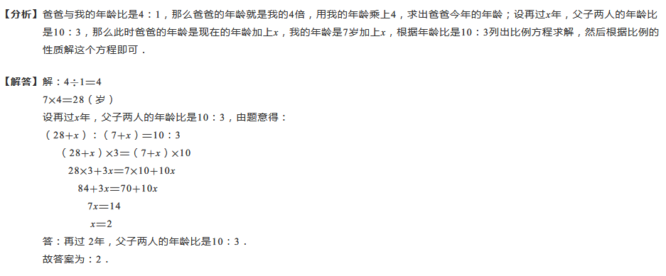 今年爸爸的年龄和我的年龄比是4:1,我今年7岁,再过多少年,父子两人的年龄比是10:3?
