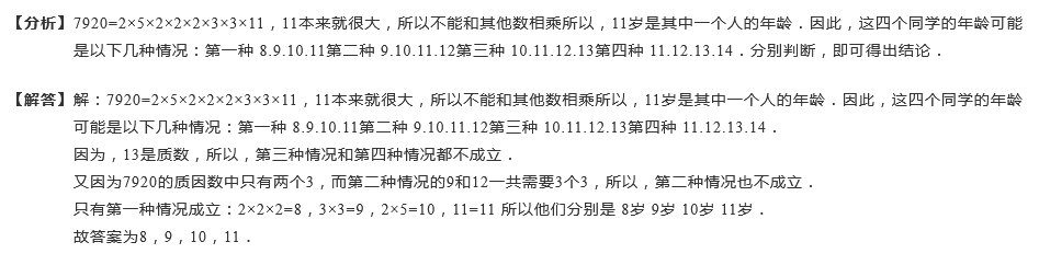 有4四个同学,他们的年龄是连续的自然数,他们的年龄之积是7920,他们分别是多少岁?