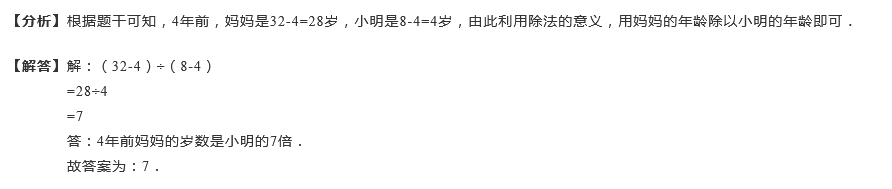 今年妈妈32岁,小明8岁,4年前妈妈的年龄正好是小明的多少倍?