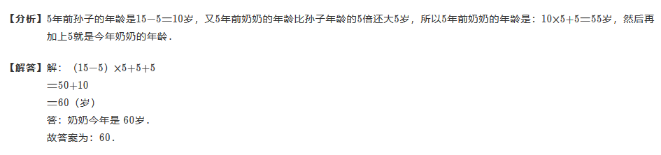 5年前奶奶的年龄比孙子年龄的5倍大5岁,今年孙子15岁,那么奶奶今年多少岁?