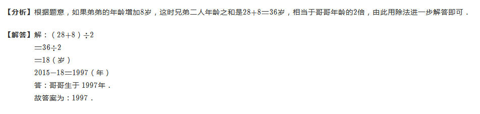 2015年兄弟二人的年龄和是28岁,年龄差是8岁,则哥哥生于哪一年?